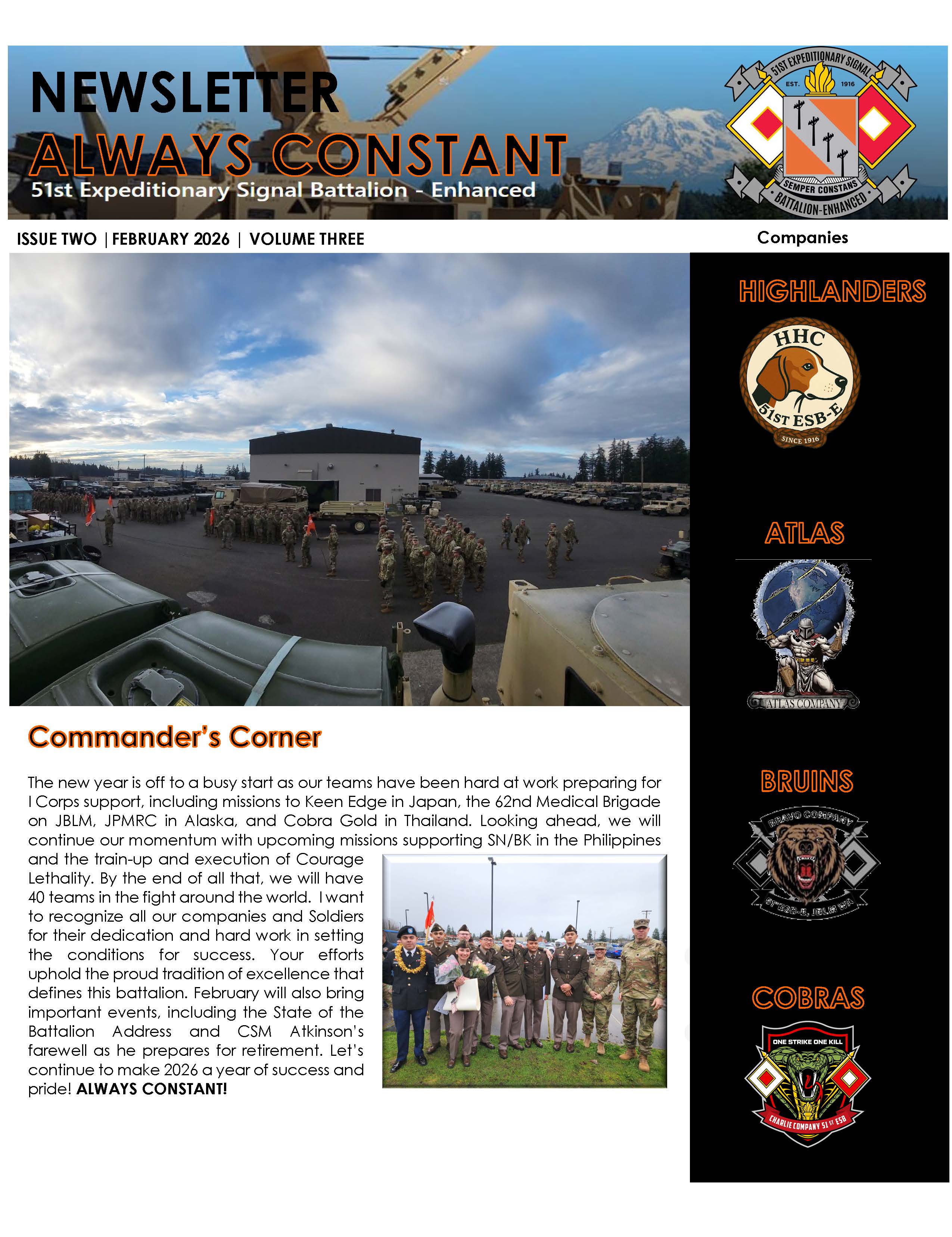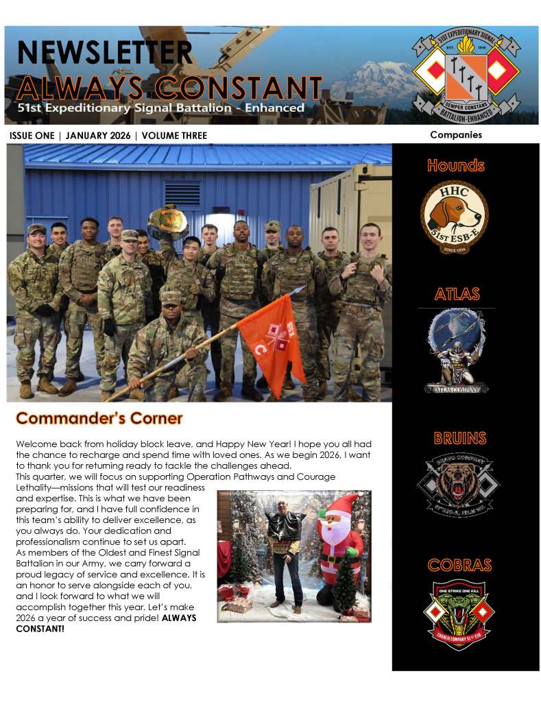 The 51st Expeditionary Signal Battalion-Enhanced (ESB-E) is the oldest active Signal Battalion in the U.S. Army stationed out of Joint Base Lewis McChord. I had the privilege and honor to serve as the Battalion Command Sergeant Major from 25 Jan 2024 until present. This page showcases some of the artifacts the team created throughout my tenure with the Battalion. This organization will always have a special place in my heart.
