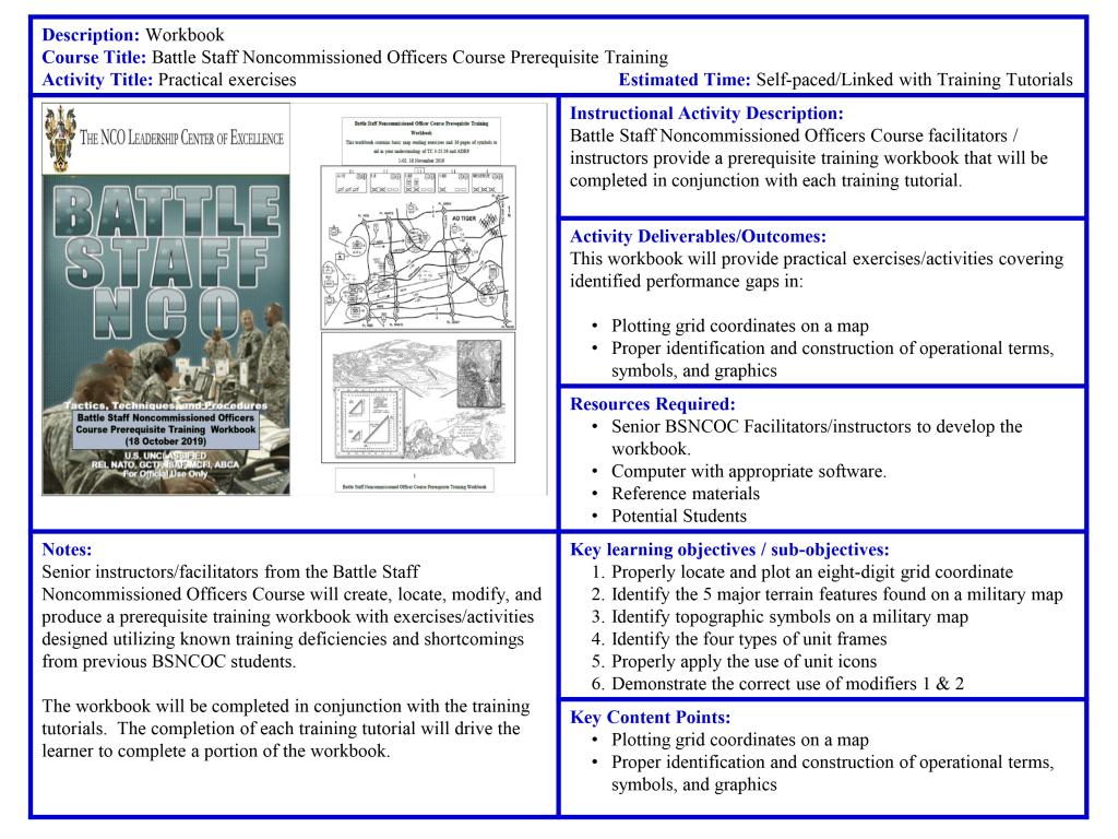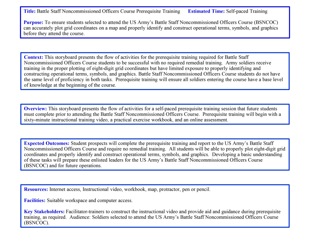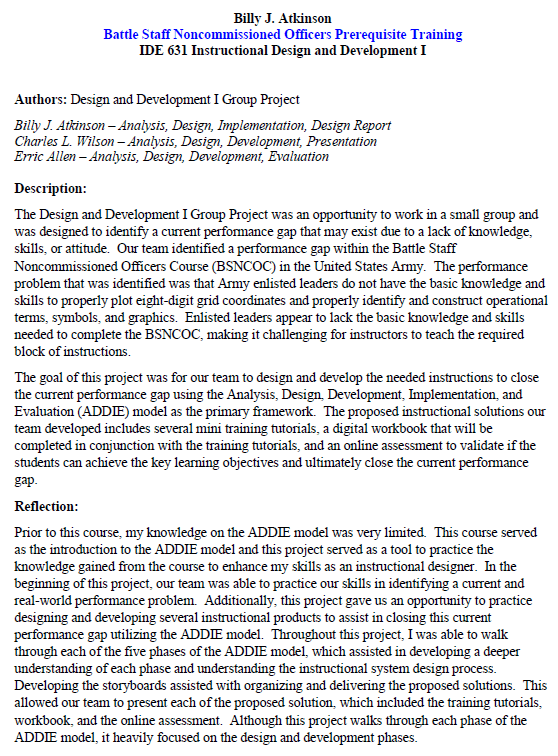 This project was completed in small teams and designed to find a performance gap that was due to a lack of knowledge, skills, or attitude. Throughout this project, the model used was the Analysis, Design, Development, Implementation, and Evaluation (ADDIE) model. The objective of this project was to develop instructions to close the performance gap. The proposed instructional solution included several mini training tutorials, a digital workbook that will be completed in conjunction with the training tutorials, and an online assessment to validate if the students can achieve the key learning objectives.