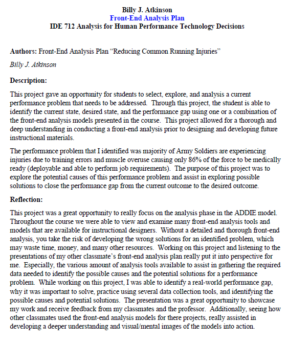 This project gave an opportunity for students to select, explore, and analysis a current performance problem that needs to be addressed. Through this project, the student is able to identify the current state, desired state, and the performance gap using one or a combination of the front-end analysis models presented in the course. This project allowed for a thorough and deep understanding in conducting a front-end analysis prior to designing and developing future instructional materials.